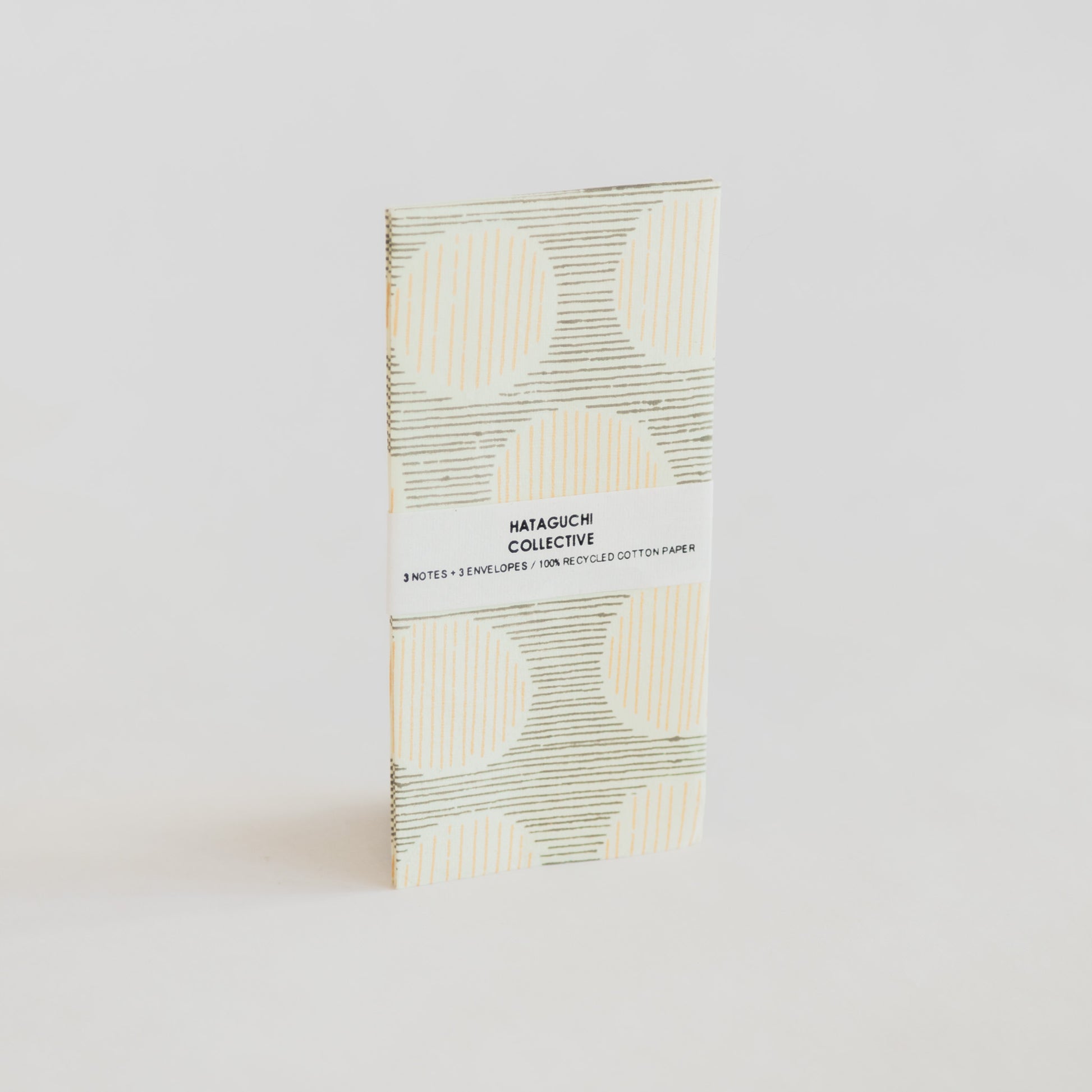 This envelope set includes 3 blank cards (6.75" x 3.5”) with a matching pattern printed on the other side. Hataguchi Collective's paper is hand screen printed on up-cycled cotton pulp paper from the garment manufacturers - a tree-free alternative to modern papers.